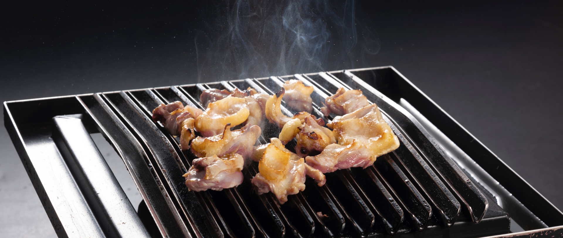 炭火焼きの美味しさを追求し、より美味しく焼き上げる鉄板を開発しました。網と違い、脂が炭火に落ちにくいため、煙の発生を抑えるように工夫しています。炭火からの遠赤外線効果は余すところなく肉に伝導するため、内部に早く火が通り、旨味を逃がさずふっくらと仕上げます。